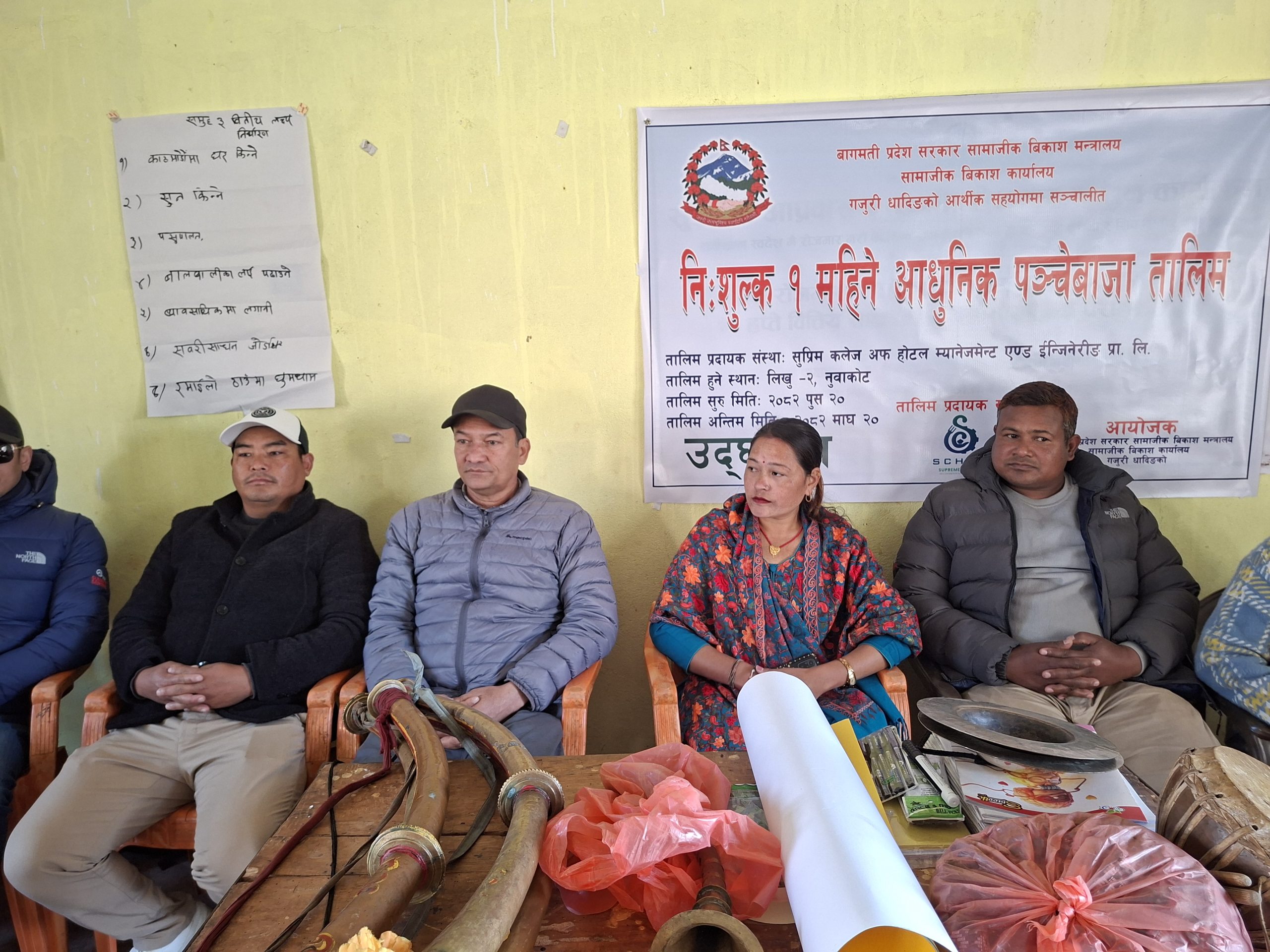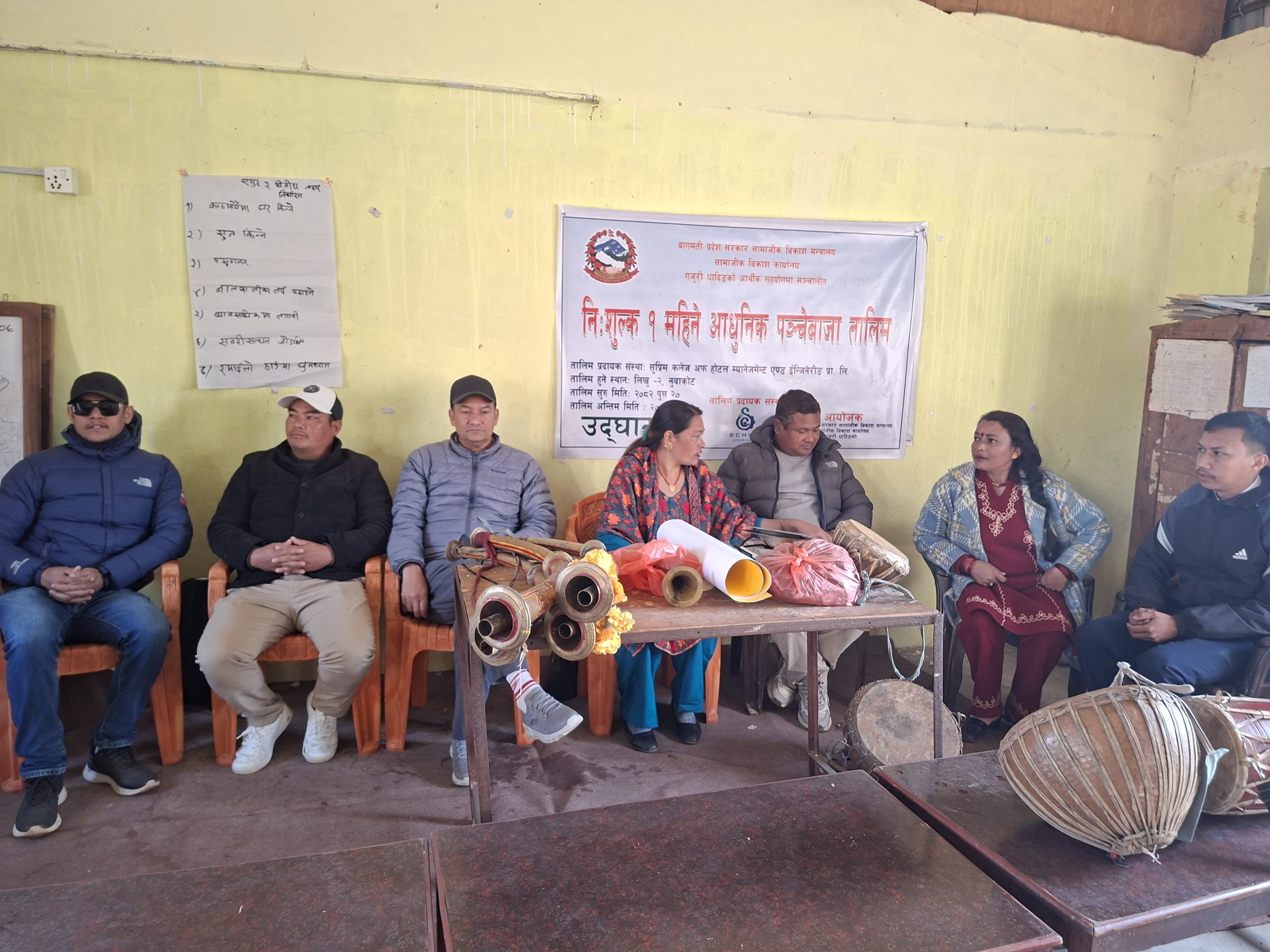 नुवाकोट — बागमती प्रदेश सरकार सामाजिक विकास मन्त्रालयअन्तर्गत सामाजिक विकास कार्यालय, धादिङको सहयोगमा दलित महिलाहरू लक्षित निःशुल्क एक महिने आधुनिक पञ्चेबाजा तालिम आजदेखि सुरु गरिएको छ।